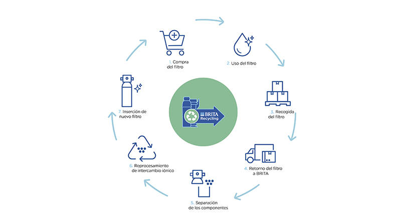 En el segmento profesional, Brita innova con la gama iQ World y sistemas de refill para cartuchos. El reciclaje de filtros profesionales ( 80-85%) permite recuperar y reutilizar cerca del 21% de la resina de intercambio iónico en nuevos productos.