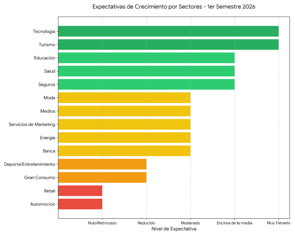 De cara a este primer semestre de 2026, el mapa cambia ligeramente. Turismo y Tecnología siguen liderando con previsiones de crecimiento muy elevadas, seguidos ahora por Seguros, Salud y Educación, que esperan repuntar. La cara amarga se la llevan la Automoción y el Retail: pese al buen cierre de año del sector del automóvil, ambos sectores presentan ahora las perspectivas más sombrías, sin esperar crecimiento e incluso anticipando retrocesos.